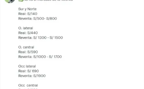 Para tener una idea qué tan elevados podrían estar las ventas de las reventas, estos serían los precios aproximados en los que se estarían comercializando. Las tribunas populares, Norte y Sur, la cual se estaba vendiendo, de manera oficial a 140 soles, el precio se ha inflado entre S/ 500 a S/ 800. Oriente lateral tiene como precio real S/ 440, pero se estaría vendiendo entre S/ 1300 a S/ 1500, mientras que en la misma tribuna pero la parte central el monto en la web figura en S/ 590 pero actualmente se estaría ofreciendo, de manera informal, a S/ 1000 a S/ 1700.