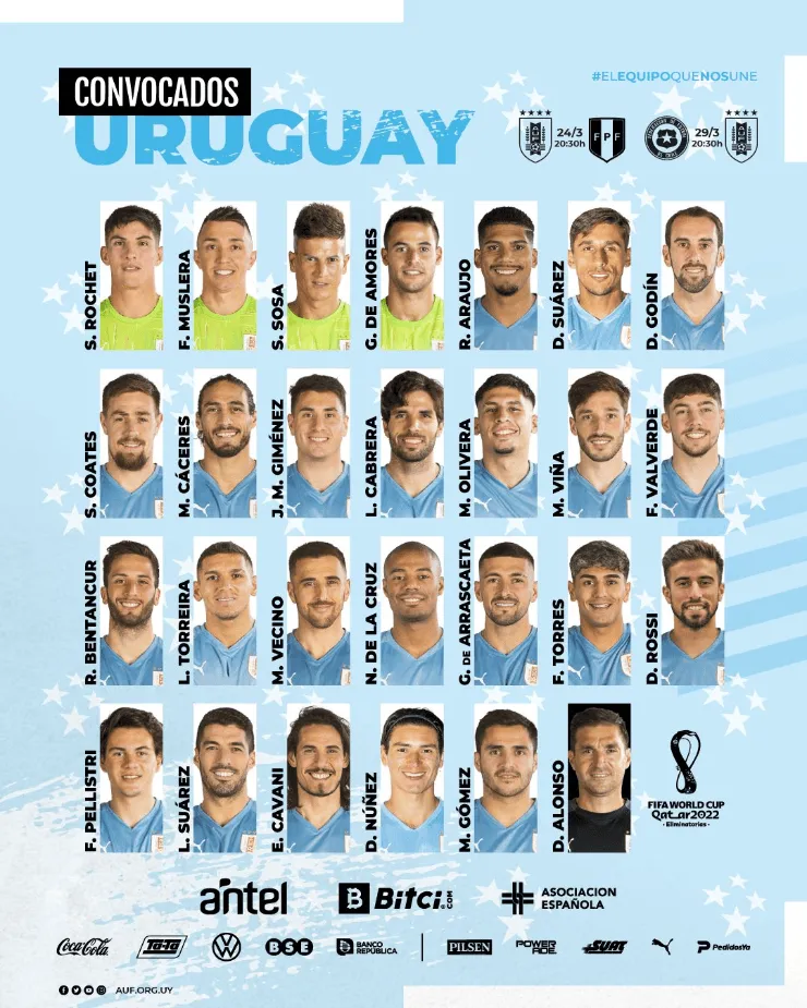 Delanteros: Luis Suárez, Edinson Cavani, Darwin Núñez, Diego Rossi y Maximiliano Gómez