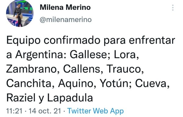 En la previa, se habló de las bajas que tenía Perú y los posibles cambios. A más de 6 horas para el partido, Milena Merino de Gol Perú confnirmó el equipo con algunas sorpresas:Gallese; Lora, Zambrano, Callens, Trauco, Canchita, Aquino, Yotún; Cueva, Raziel y Lapadula.