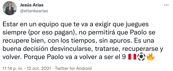 Jesus el Tanke Árias, por ejemplo, escribió lo siguiente: “Estar en un equipo que te va a exigir que juegues siempre (por eso pagan), no permitirá que Paolo se recupere bien, con los tiempos, sin apuros. Es una buena decisión desvincularse, tratarse, recuperarse y volver. Porque Paolo va a volver a ser el 9”. Buenas palabras.