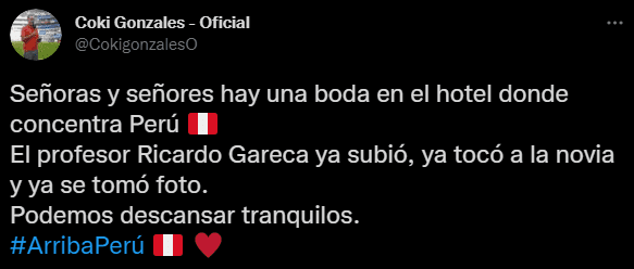 “Señoras y señores hay una boda en el hotel donde concentra Perú. El profesor Ricardo Gareca ya subió, ya tocó a la novia y ya se tomó foto. Podemos descansar tranquilos. #ArribaPerú”. Fue lo que comentó el también panelista de RPP Noticias, quien interactuó con sus seguidores tras esta revelación.