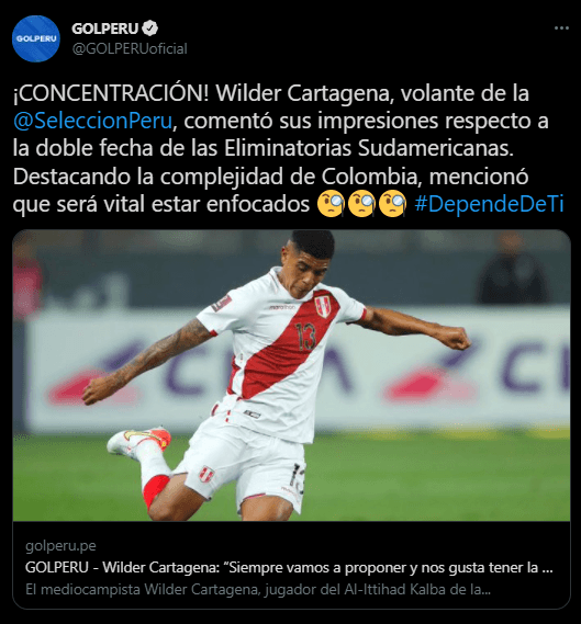 La mentalidad del plantel comandado por Ricardo Gareca está arriba. Todos los futbolistas convocados por ‘El Tigre’ son conscientes de la situación que estamos viviendo, donde hoy es el todo o nada. Un ejemplo claro es el de Wilder Cartagena, el mediocampista del fútbol de Emiratos Árabes.