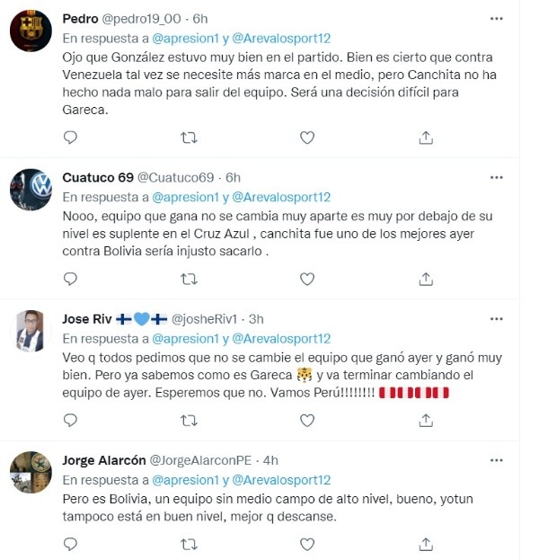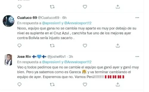 El programa de YouTube ‘A presión’ publicó en su cuenta de Twitter los siguiente: “Yotún vuelve a estar disponible, pero el mediocampo funcionó bien ante Bolivia”, a lo que más abajo preguntó “¿Lo pondrías frente a Venezuela?”. Esto daría pie para que los hinchas respondan de la siguiente manera: “No, equipo que gana no se cambia”, “No es difícil, sale Gonzáles”, “Que siga calentando banca”, fueron los comentarios de la afición.