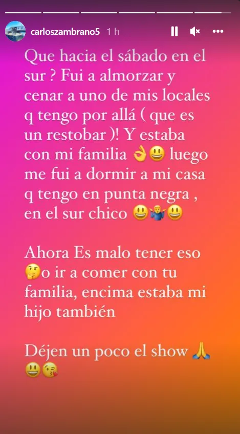 “¿Qué hacía el sábado en el sur? Fui a almorzar y cenar a uno de mis locales que tengo por allá (que es un restobar). Y estaba con mi familia, luego me fui a dormir a mi casa que tengo en Punta Negra, en el Sur Chico. Ahora, ¿es malo tener eso o ir a comer con tu familia? Estaba con mi hijo. Dejen un poco el show”, fueron las palabras del defensor nacional sobre su salida al sur de Lima.