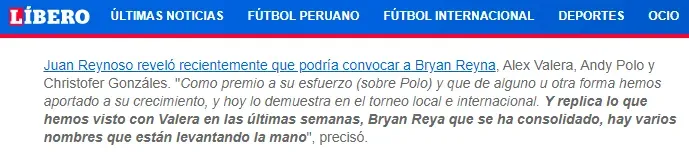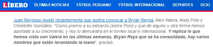 Por otro lado, el director técnico de la bicolor manifestó que podría convocar a Bryan Reyna, Alex Valera, Andy Polo y Christofer Gonzáles como premio a sus esfuerzos y buenas actuaciones en la Liga 1.