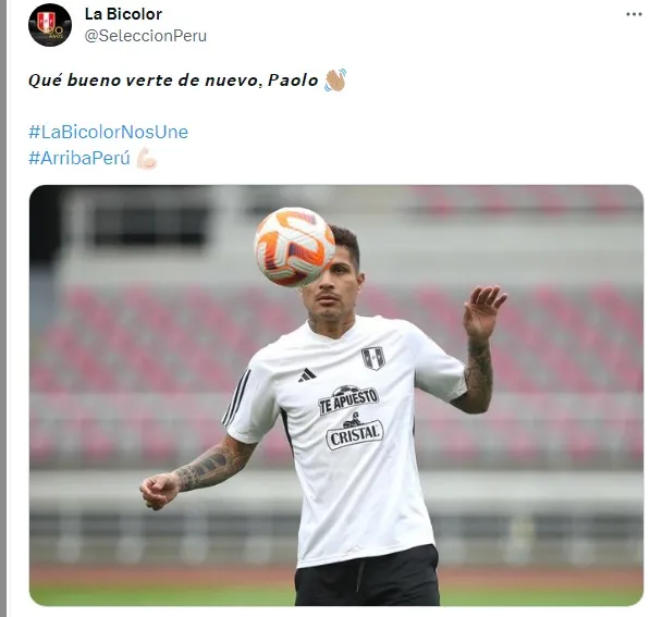 “Qué bueno verte de nuevo, Paolo. La Bicolor nos une. Arriba Perú”, se lee en el Twitter.