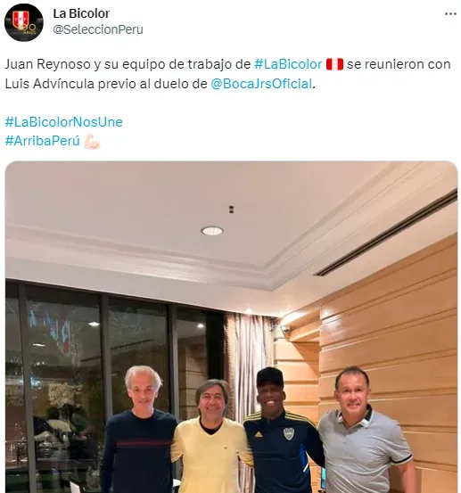 “Juan Reynoso y su equipo de trabajo de La Bicolor 🇵🇪 se reunieron con Luis Advíncula previo al duelo de Boca Juniors”, escribió una de las cuentas oficiales de la Bicolor.