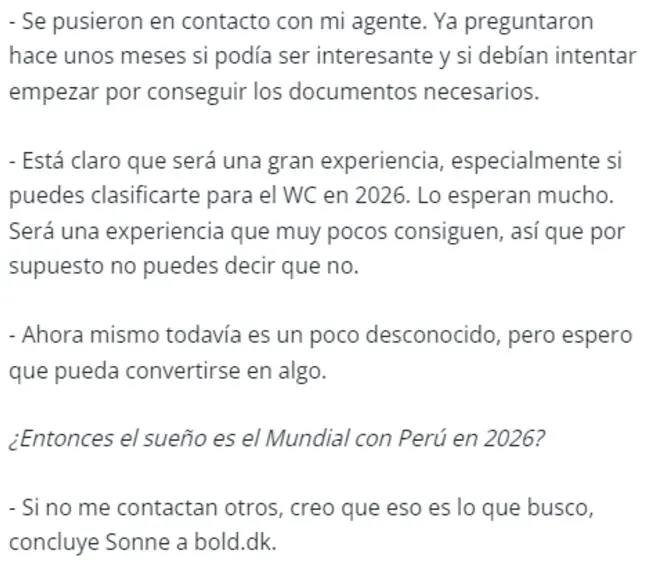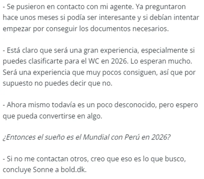 En conversación con bold.dk de Dinamarca, dejó una frase muy interesante, donde expone su presencia y deseo de jugar por Perú: “Está claro que será una gran experiencia, especialmente si puedes clasificarte para la World Cup en 2026… ‘¿Entonces el sueño es el Mundial con Perú en 2026?’ Si no me contactan otros, creo que eso es lo que busco”.