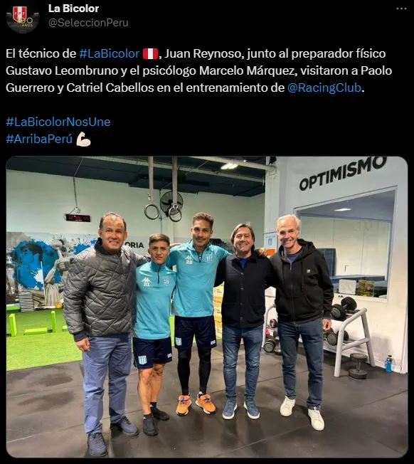 Lo comunicó de la siguiente manera la cuenta de la Selección Peruana en Twitter: “El técnico de La Bicolor, Juan Reynoso, junto al preparador físico Gustavo Leombruno y el psicólogo Marcelo Márquez, visitaron a Paolo Guerrero y Catriel Cabellos en el entrenamiento de Racing Club de Avellaneda”.