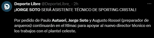 Según una reciente información del periodista Percy Ramos durante la transmisión oficial de ‘L1 MAX’ del partido entre Alianza Atlético de Sullana vs. Sporting Cristal, Jorge Soto se quedará en Sporting Cristal como asistente técnico de Paulo Autuori para lo que resta de la presente temporada 2025. Es así que los sucesos del pasado realmente quedarán de lado en la interna del Rímac.
