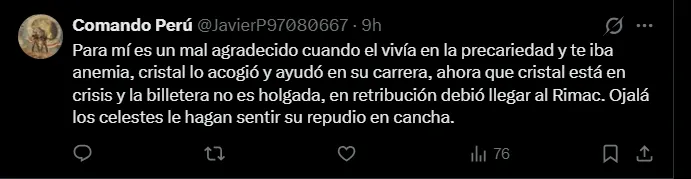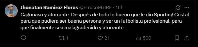 “Después de todo lo bueno que le dio Sporting Cristal para que pudiera ser buena persona y ser un futbolista profesional, para que finalmente sea malagradecido y atorrante” y “Para mí es un mal agradecido. Cuando él vivía en la precariedad y tenía anemia, Cristal lo acogió y ayudó en su carrera. Ahora que Cristal está en crisis y la billetera no es holgada, en retribución debió llegar al Rímac”; son algunos de los comentarios de los hinchas celestes en ‘X’.