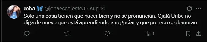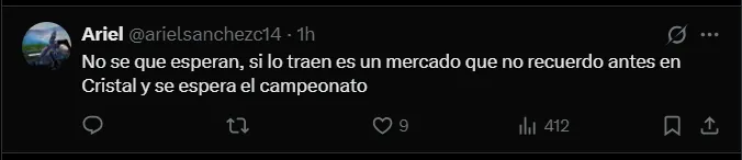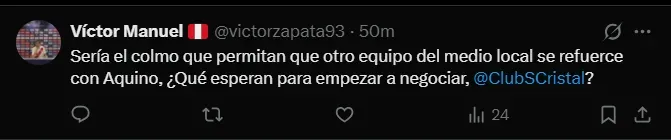 “No sé que esperan, si lo traen es un mercado que no recuerdo antes en Cristal y se espera el campeonato”, “Sería el colmo que permitan que otro equipo del medio local se refuerce con Aquino, ¿qué esperan para empezar a negociar?” y “Solo una cosa tienen que hacer bien y no se pronuncian. Ojalá Uribe no diga de nuevo que está aprendiendo a negociar y que por eso se demoran”; son algunos de los comentarios más llamativos de los hinchas de Sporting Cristal.