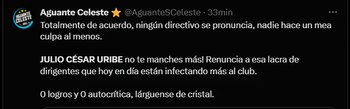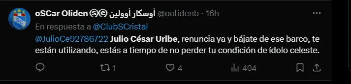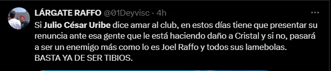 “Si Julio César Uribe dice amar al club, en estos días tiene que presentar su renuncia ante esa gente que le está haciendo daño a Cristal y sino pasará a ser un enemigo más como lo es Joel Raffo“, “Julio César Uribe no te manches más. Renuncia a esa lacra de dirigentes que hoy en día están infectando más al club” y “Julio César Uribe renuncia ya y bájate de ese barco. Te están utilizando, estás a tiempo de no perder tu condición de ídolo celeste”; son algunos de los comentarios de los hinchas rimenses hacia el popular ‘Diamante‘.