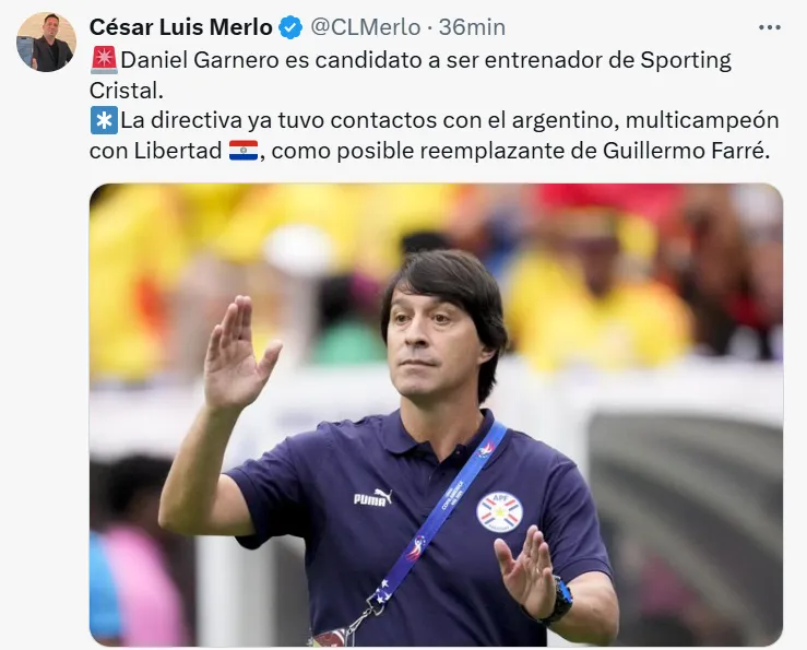 La noticia la brindó el periodista César Luis Merlo en su cuenta de X. Ahí, el hombre de prensa expresó que Sporting Cristal va por Daniel Garnero: “Daniel Garnero es candidato a ser entrenador de Sporting Cristal. La directiva ya tuvo contactos con el argentino, multicampeón con Libertad, como posible reemplazante de Guillermo Farré”.