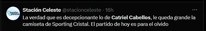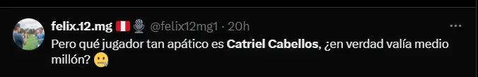“Sporting Cristal paga medio millón por Catriel Cabellos, pero en la cancha su fútbol vale bastante menos que su pasaporte”, “Pero qué jugador tan apático es Catriel Cabellos, ¿en verdad valía medio millón?”, “Nadie entiende porque Catriel Cabellos sigue en Sporting Cristal. Es deprimente verlo, qué cólera” y “La verdad que es decepcionante lo de Catriel Cabellos, le queda grande la camiseta de Sporting Cristal“; son algunas de las críticas del hincha celeste hacia el volante.
