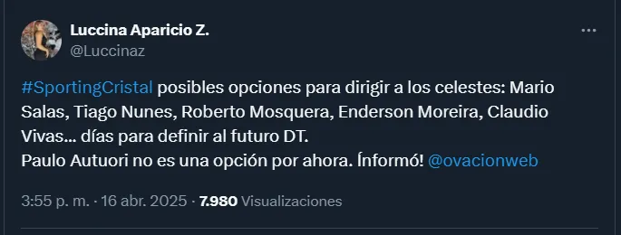 Según una reciente información de la periodista deportiva Luccina Aparicio, Tiago Nunes se encuentra en una lista selecta de candidatos muy importantes para tomar el mando de Sporting Cristal tras el más reciente adiós del argentino Guillermo Farré. “Sporting Cristal: posibles opciones para dirigir a los celestes: Mario Salas, Tiago Nunes, Roberto Mosquera, Enderson Moreira, Claudio Vivas… días para definir al futuro DT. Paulo Autuori no es una opción por ahora”; detalló a través de su cuenta oficial de ‘X’.
