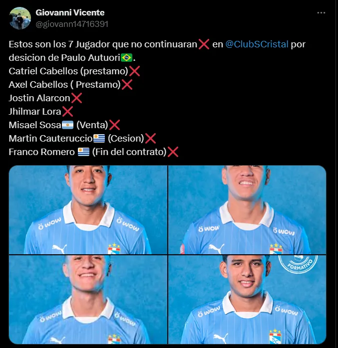 De acuerdo a una reciente revelación del comunicador deportivo Giovani Vicente, los siete jugadores que se marcharán de Sporting Cristal son: Catriel Cabellos, Axel Cabellos, Jostin Alarcón, Jhilmar Lora, Misael Sosa, Martín Cauteruccio y Franco Romero. De estos nombres, hay dos que ya no están más en La Florida y por ende quedaría esperar la oficializar de los otros protagonistas.