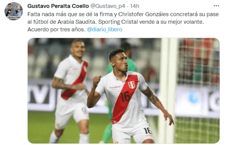 Aún no se ha podido confirmar el equipo donde ‘Canchita’ estampará su firma, pero, según informó el periodista Gustavo Peralta,el contrato seríapor los próximos tres años. “Falta nada más que se dé la firma y Christofer Gonzáles concretará su pase al fútbol de Arabia Saudita. Sporting Cristal vende a su mejor volante. Acuerdo por tres años”, escribió el comunicador en su cuenta de Twitter.
