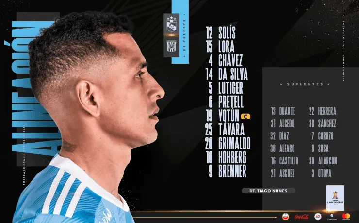 Sporting Cristal: Renato Solís; Jhilmar Lora, Ignacio Da Silva, Gianfranco Chávez, Yoshimar Yotún; Jesús Castillo, Jesús Pretell, Martín Távara; Joao Grimaldo, Jostin Alarcón y Brenner Marlos.