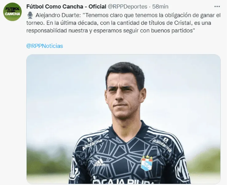 El arquero de Sporting Cristal, Alejandro Duarte, habló este miércoles en una entrevista con RPP Noticias, sobre lo que será el duelo en Arequipa ante FBC Melgar, de la importancia del Alberto Gallardo y de la obligación que tienen de conseguir el título nacional de la Liga 1 al final de la temporada.