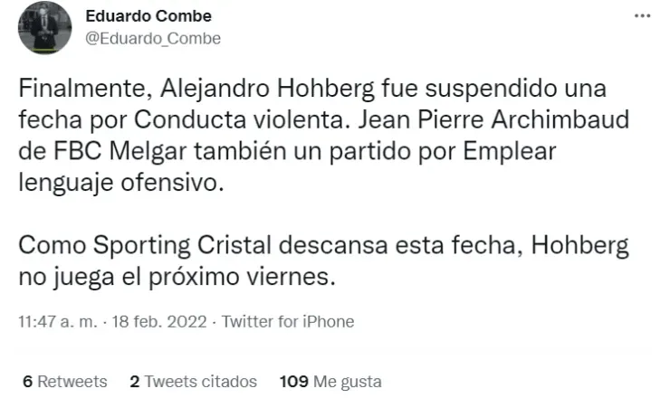 “Finalmente, Alejandro Hohberg fue suspendido una fecha por Conducta violenta. Jean Pierre Archimbaud de FBC Melgar también un partido por Emplear lenguaje ofensivo. Como Sporting Cristal descansa esta fecha, Hohberg no juega el próximo viernes”, reveló el periodista de Canal N en su cuenta de Twitter.