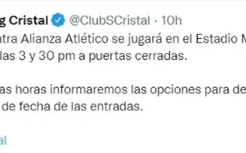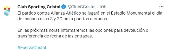 “El partido contra Alianza Atlético se jugará en el Estadio Monumental el día de mañana a las 3 y 30 pm a puertas cerradas. En las próximas horas informaremos las opciones para devolución o transferencia de fecha de las entradas”, comunicó Sporting Cristal en sus redes oficiales.