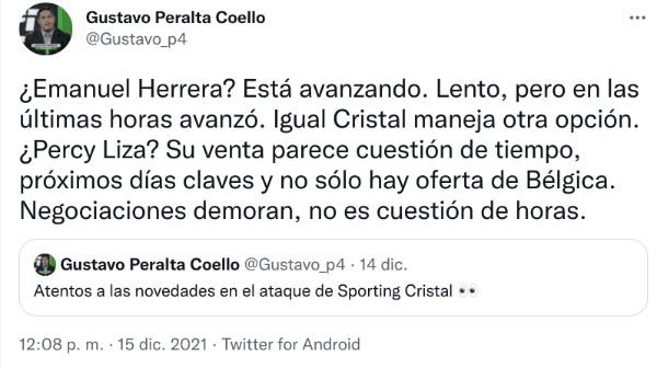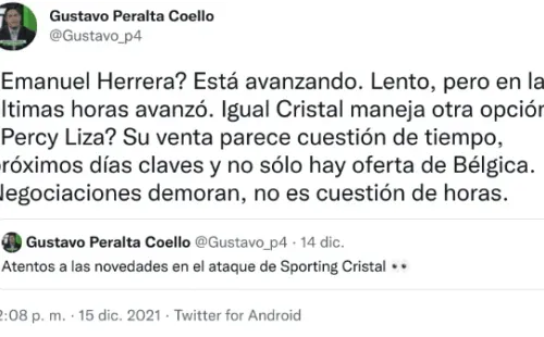 “¿Emanuel Herrera? Está avanzando. Lento, pero en las últimas horas avanzó. Igual Cristal maneja otra opción. ¿Percy Liza? Su venta parece cuestión de tiempo, próximos días claves y no sólo hay oferta de Bélgica. Negociaciones demoran, no es cuestión de horas”, señaló el mencionado comunicador.