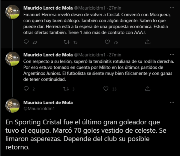 La explicación va desde este lado: “Emanuel Herrera reveló deseo de volver a Cristal. Conversó con Mosquera, con quien hay buen diálogo. También con algún dirigente. Saben lo que puede dar. Herrera está a la espera de una propuesta económica. Estudia otras ofertas también. Tiene 1 año más de contrato con AAAJ”.