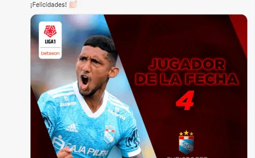 “Con dos goles y una asistencia, Christofer Gonzáles fue pieza fundamental para que Sporting Cristal consiga su primer triunfo en el 2022. El volante fue elegido el Jugador de la Fecha 4 de la Liga1 Betsson Apertura”, fue el mensaje citado por la cuenta oficial de la Liga 1.
