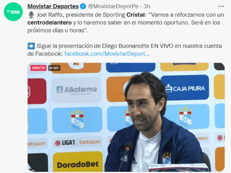 Joel Raffo, presidente de Sporting Cristal,le dio la bienvenida este jueves a Diego Buonanotte, ‘flamante’ refuerzo del cuadro ‘celeste’ para el Torneo Clausura. Asimismo,mostró su alegría por haber podido concretar elfichaje del exjugador de Universidad Católica, y aseguró que pronto habrá novedades sobre el nuevo centrodelantero que llegará a La Florida.