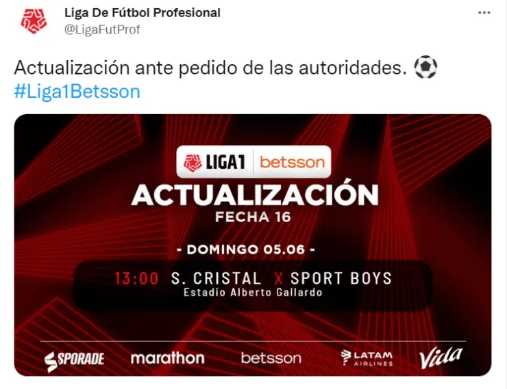 El partido clave entreSporting Cristal y Sport Boys, por la fecha16 del Torneo Apertura de laLiga 1 fue reprogramadoeste miércolesdebido a la falta de garantías por parte de las autoridades, así lo informaron los organizadores del torneo mediante sus redes sociales. Cabe resaltar que este duelo estaba pactado para disputarse el sábado 28 de mayo.