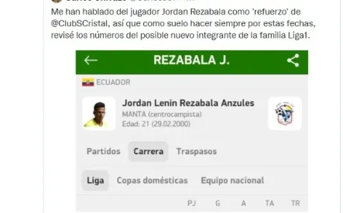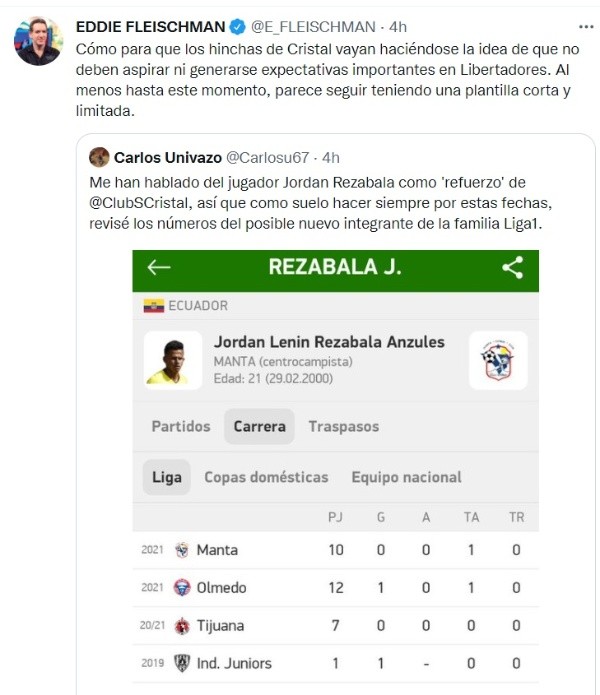 El periodista Eddie Fleischman publicó en su cuenta de Twitter un comentario sobre Sporting Cristal dando a entender que no podrán llegar lejos en la Copa Libertadores 2022: “Como para que los hinchas de Cristal vayan haciéndose la idea de que no deben aspirar ni generarse expectativas importantes en la Libertadores. Al menos hasta el momento, parece seguir teniendo una plantilla corta y limitada”, escribió el periodista deportivo.
