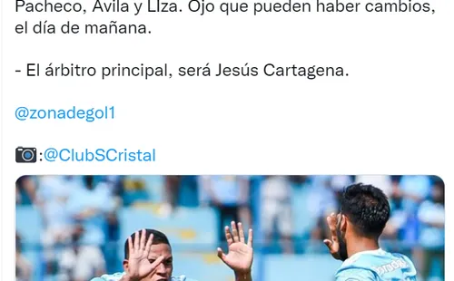 “Posible once ante UTC sería el siguiente: Solís, Lora, Merlo, Chavéz, Loyola, Castillo, Calcaterra, Gonzáles, Pacheco, Ávila y Liza. Ojo que puedehaber cambios el día de mañana. El árbitro principal, será Jesús Cartagena”, fue el mensaje publicado por el periodista Rodrigo Cerna que cubre información del cuadro rimense.