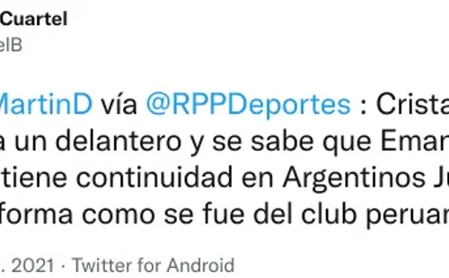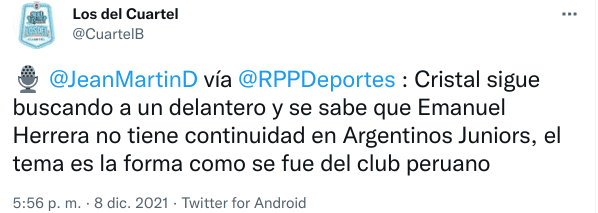 “Puedo asegurar que Emanuel Herrera expresó su deseo de volver a Cristal”, señaló por ejemplo Mauricio Loret de Mola. “Cristal sigue buscando a un delantero y se sabe que Emanuel Herrera no tiene continuidad en Argentinos Juniors, el tema es la forma como se fue del club peruano”, informó Jean Martín recordando su partida con ciertos conflictos ¡A seguir esperando!
