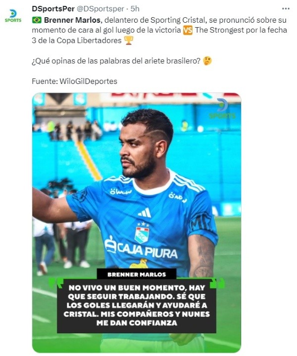 No pasando un buen momento en Sporting Cristal, el delantero brasileño Brenner Marlos no viene dando respuestas al fanático celeste. Con una bajísima producción goleadora, el ariete entiende su situación y lamentó no convertir tantos ni en Copa Libertadores ni en la Liga 1.