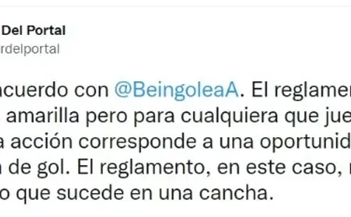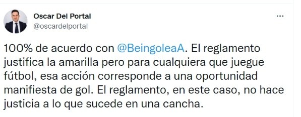 Para la gran parte de personas esta jugada merecía una tarjeta roja para el portero de Sporting Cristal, pues el delantero de Alianza Lima se iba directamente, y con grandes opciones para anotar el segundo para los ’íntimos’. El comunicador Óscar del Portal puso en cuenta de Twitter: “100% de acuerdo con Alberto Beingolea. El reglamento justifica la amarilla pero para cualquiera que juegue fútbol, esa acción corresponde a una oportunidad manifiesta de gol. El reglamento, en este caso, no hace justicia a lo que sucede en una cancha”.