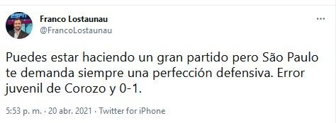 Franco Lostaunau también se manifestó en las redes. “Puedes estar haciendo un gran partido pero São Paulo te demanda siempre una perfección defensiva. Error juvenil de Corozo y 0-1”, escribió.