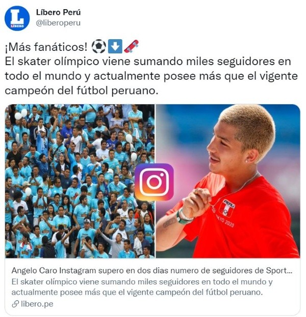 El skater peruano ha conseguido aproximadamente 300 mil seguidores en un tiempo récord, superando a nada másy nada menos que al club Sporting Cristal. Con sus‘followers’ de Angelo Caro en aumento con el trascurrir de los días, no solo de peruanos, sino de personas de otros países que también lo vieron competir en los Juegos Olímpicos. Este hecho fue empleado por el diario Líbero para hacer la “extraña” comparación.