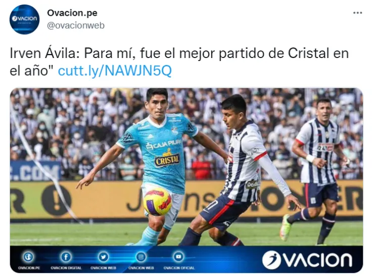 Irven Ávila, jugador de Sporting Cristal, consideró que si bien ayer no crearon tantas ocasiones de gol ante Alianza Lima, ganaron el partido por 1-0 yse mostró satisfecho con el partido realizado en su visita al estadio Alejandro Villanueva. Cabe resaltar que este triunfo de alguna manera le devolvió la credibilidad a Roberto Mosquera, quien había sido criticado durante las primeras fechas por el rendimiento de su equipo.