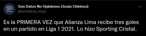 “Es la PRIMERA VEZ que Alianza Lima recibe tres goles en un partido en Liga 1 2021. Lo hizo Sporting Cristal”. Después de redactado esto, los hinchas del campeón nacional en los años pares, saludaron el dato. Mientras que los ‘blanquiazules’ esperan levantar cabeza pronto.