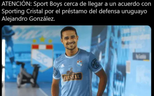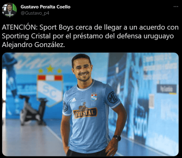 Por ese motivo, la información del periodista del Diario Líbero y ESPN, Gustavo Peralta, sería positiva para los ‘rimenses’: “ATENCIÓN: Sport Boys cerca de llegar a un acuerdo con Sporting Cristal por el préstamo del defensa uruguayo Alejandro González”.
