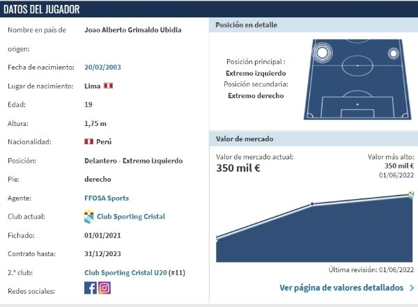 De cualquier modo, la consolidación de Joao Grimaldo en Sporting Cristal empieza a ser una realidad. Empezando a vislumbrar sus primeros réditos, con 19 años el extremo está tasado en 350 mil dólares. Con contrato en tienda celeste hasta diciembre del 2023, es hora de empezar a pensar en su renovación.