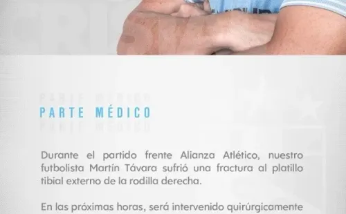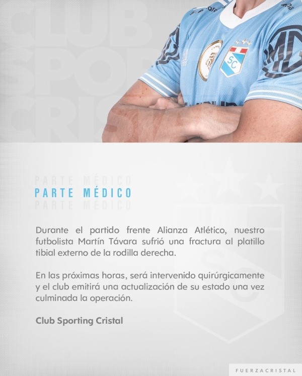 “Durante el partido frente a Alianza Atlético, nuestro futbolista Martín Távara sufrió una fractura al platillo tibial externo de la rodilla derecha. En las próximas horas, será intervenido quirúrgicamente y el club emitirá una actualización de su estado una vez culminada la operación. Club Sporting Cristal”. Anuncia el reciente campeón nacional.