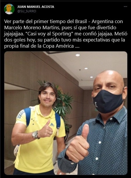 “Ver parte del primer tiempo del Brasil – Argentina con Marcelo Moreno Martins, pues sí que fue divertido jajajaja. “Casi voy al Sporting” me confió jajaja. Metió dos goles hoy, su partido tuvo más expectativas que la propia final de la Copa América”. Precisó el popular ‘susurro’.