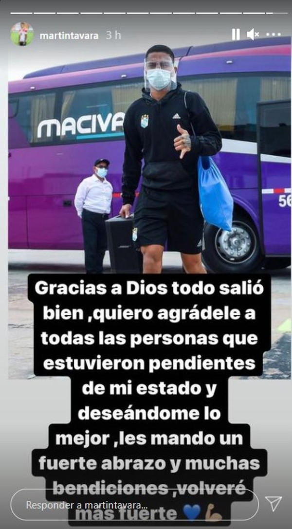 “Gracias a Dios, todo salió bien. Quiero agradecerles a todas las personas que estuvieron pendientes de mi estado y deseándome lo mejor. Les mando un fuerte abrazo y muchas bendiciones. Volveré más fuerte”. Informó Martín Távara desde su cuenta principal de Instagram, en la historia subida se le ve en una fotografía de archivo levantando el pulgar.