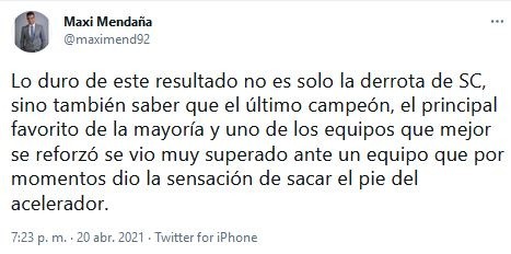 “Lo duro de este resultado no es solo la derrota de SC, sino también saber que el último campeón, el principal favorito de la mayoría y uno de los equipos que mejor se reforzó se vio muy superado ante un equipo que por momentos dio la sensación de sacar el pie del acelerador”, escribió el periodista.