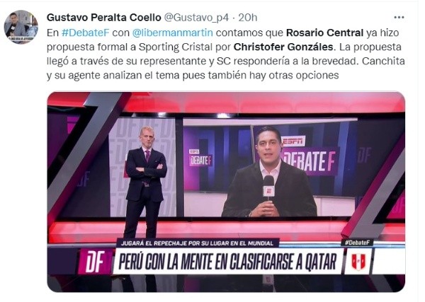“Rosario Central ha hecho el día de hoy una propuesta formal a Sporting Cristal, por la compra del jugador. Quieren a Christofer Gonzales en Rosario Central, esto ha llegado a través del representante que ha sido presentada al club. Hay una diferencia económica. Sin embargo, es una propuesta muy buena. Entendemos que el jugador quiere ir y hay muchas posibilidades”, sostuvo el reportero de ESPN Gustavo Peralta.