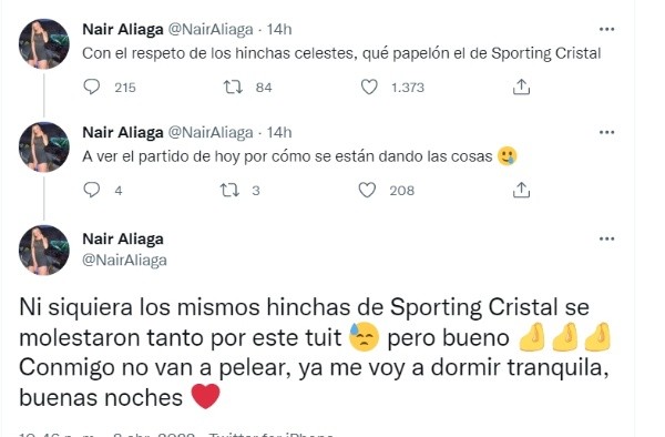 La periodista Nair Aliaga opinó al respecto y publicó en su cuenta de Twitter lo siguiente: “Con el respeto de los hinchas celestes, qué papelón el de Sporting Cristal”, sostuvo la conductora de GOLPERU tras la caída de los celestes, en un partido donde tenían todo para remontarlo y finalmente ganarlo, algo que no sucedió con los dirigidos por Roberto Mosquera.