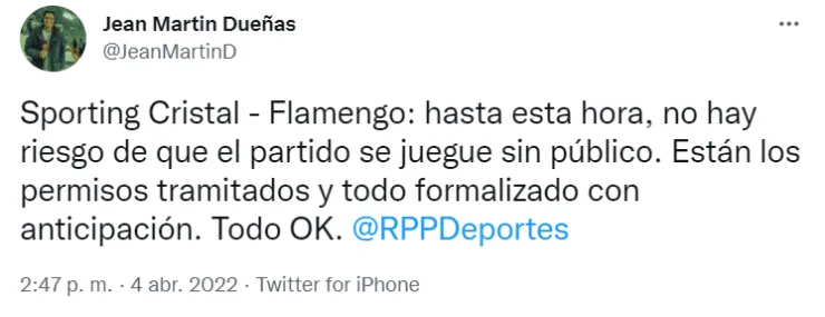 “Sporting Cristal vs.Flamengo: hasta esta hora, no hay riesgo de que el partido se juegue sin público. Están los permisos tramitados y todo formalizado con anticipación. Todo ok”, reveló el periodistaJean Martin Dueñas para RPP Noticias.
