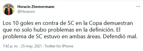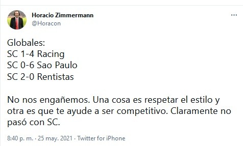 Luego, apunto al entrenador y su “estilo”: “Globales: SC 1-4 Racing, SC 0-6 Sao Paulo y SC 2-0 Rentistas. No nos engañemos. Una cosa es respetar el estilo y otra es que te ayude a ser competitivo. Claramente no pasó con SC”. Así, dispartó Horacio ¡Picante Zimmermann!
